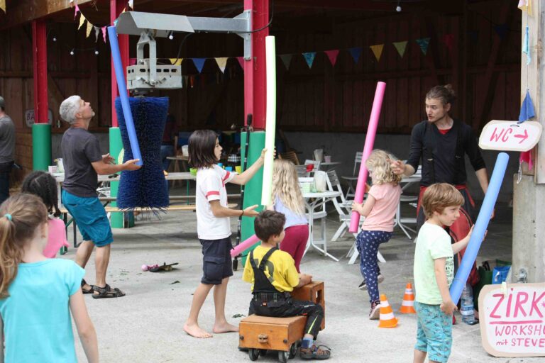 Durchgehende Zirkusanimation mit Akrobatikbahn, Balancefass, Riesenseifenblasen und einer bunten Kiste voller Jongliermaterial.